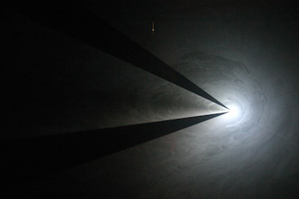 McCall’s seminal 1973 piece, Line Describing a Cone is a deconstructive act examining the conditions of film. Distilling the very material of film – projected light and duration – the reductive piece begins with a beam of light, a point, that over the course of half an hour draws a circle on the surface of a wall. An ephemeral, mesmerizing play of optics occurs as flowing particles of haze are drawn out of the shadows, illuminated by the light beam headed towards the screen, thus creating a 3-dimensional sculpture. There is a 4th dimension at work here too, time. We are at the intersection of cinema and sculpture. Experiencing this piece under new conditions, notably, without viewing the work as originally conceived as a filmic audience – from a specific set time, beginning to end – contributes to the shift in emphasis of the work as a cinematic deconstruction to a phenomenological experience.