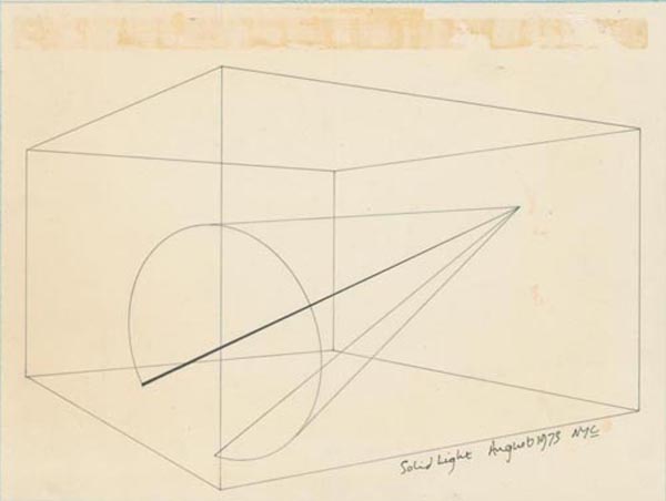 But time is a funny thing. The layers of cinema’s material evolution, and certain artworks produced since, have a temporal gravity that presses down on these works, effecting what their form implies. Today they appear as a precursor to works by artists like James Turrell and Olafur Eliasson that harness, expose and manipulate natural phenomena as a way to create phenomenological experiences. The exhibition has smartly included drawings and studies that reveal a motivation of cinematic deconstruction in addition to their phenomenological leanings, allowing the viewer to ponder the meanwhile.
