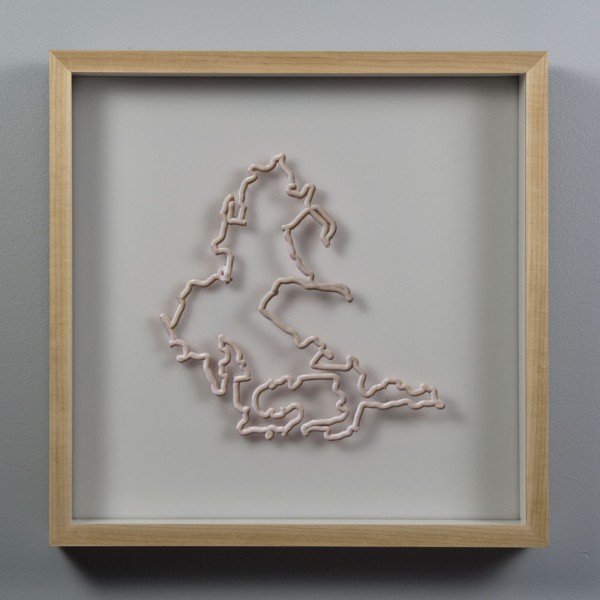 Beck’s Nebraska City Portraits (2009) give dimensional presence to otherwise abstract data. The series, created during a residency at the Kimmel Harding Nelson Center for the Arts in Nebraska City, NE, features the results of the artist shadowing different community members for a day using a GPS tracking device. These GPS plots became, in the artist’s words ‘unconventional portraits’ translated into 3D digital models on his computer. The GPS portraits were then printed using a stereolithography machine to realize the tracks in laser-cured resin. The final result was mounted in plexiglass shadow box – becoming a tangible visualization of contemporary technology and mobility on an individual level.