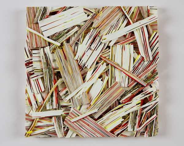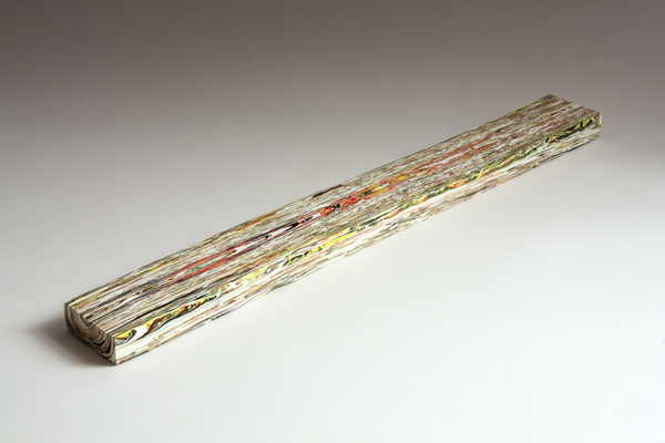 Margie Livingston’s work participates directly in this narrative, creating hybrid objects that shift back and forth between sculpture and painting as well as abstraction and representation. After making paintings on canvas for many years, Livingston began pouring paint, layering it, then cutting it and breaking it apart in order to construct objects that are images of their own making. But while these works are abstract, they begin to resemble other objects like wooden blocks, stone, or waferboard. In this sense she breaks two cardinal rules of modernist painting by making works that are images of other things while at the same time telling a story. But the images depict raw materials that have the potential for making other artworks and the story that she tells is modern art history itself. So these works become objects that at once enact pious devotion and heretical rebellion – rooted in both process and conceptual reference.