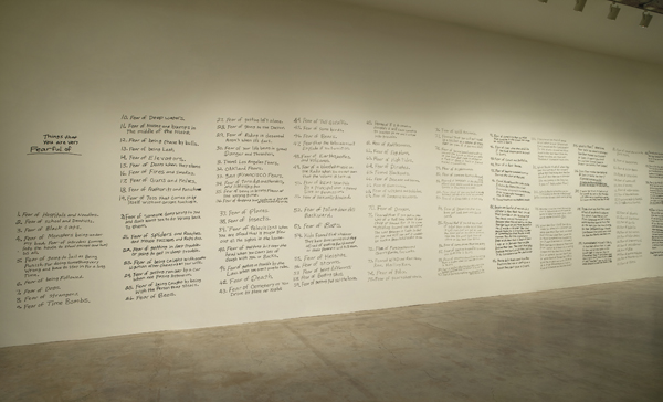 Trying to look at the artwork as untainted by the knowledge of the artists’ conditions, I saw three galleries filled with pieces so creative and uninhibited, my eyes hungrily devoured the unique detail in each piece. Four examples of Attilo Crescenti’s sprawling, surreal and abstract figure drawings demonstrate the potential of an unrestricted vision of the human form. Written in huge, black scratchy handwriting on the entire back wall of the first gallery, is Michael Bernard Loggins’ text piece “Fears of Your Life.” Loggins included all fears in his list, both the profound and the mundane: