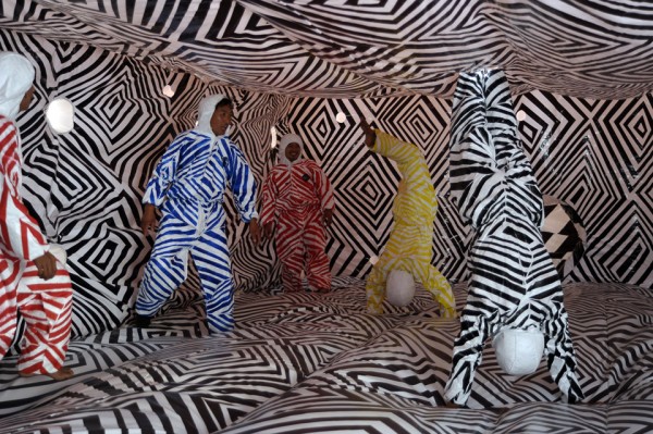 Barefoot and zipped up to the throat, I get on all fours and crawl through a tunnel into the space within the inflatable. The diamond geometric pattern of my uniform inscribes every surface within this soft room. The light is different in here, shaded, and all sound is muted. It’s quite hallucinogenic; a young boy wearing a black version of the suit dives onto the floor and laughs, “look: I’m invisible!” Watching him bounce and somersault makes me feel faintly foolish, the cautious adult; I bound gingerly around the space a few times before deciding to evacuate.