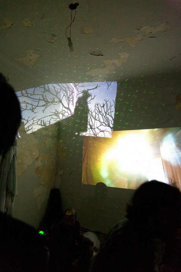 Many works dealt directly with the windows and the view, such as Alexandre Vogler’s sight test and Ronald Duarte’s laser beam reaching Christ while on Abel Duarte’s hand. Other artists worked directly with the apartment’s debris and objects. Guga Ferraz turned the freshly exposed wall insides into gold, and Baghavan transformed furniture pieces in castles of cards. Babalon was opened for everyone who wanted to grab an instrument and play along, even while keeping the bedroom doors closed. It is important not to bother next-door neighbors. They were all officially and unofficially invited, a few showed up and no one called the police. Hurray!