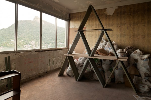 Once upon a time there was a very high hill. Then, an apartment building appeared on the hilltop, with a giant swimming pool pointing towards the Guanabara Bay. From the apartments’ windows, all of Rio de Janeiro can be seen, including the Corcovado, Sugar Loaf, the bridge to Niterói and beyond. The capital of the country had yet not been transferred from Rio to a distant flatland so a former dictator came in person to celebrate the opening of the new belvedere. Some years later, unplanned neighbors took over the building’s surrounding. People with no place to live started to build their own shacks. What a contrast: the slums and the building. Three bedroom apartments, four units on each level. Eleven stores, the last one is a penthouse with a 360º view. The pool became a target. Bullets shone at the façade while the “community” would walk in with their tires and attitude to have a swim. Close, leave, sell, run, since then the water is gone. This huge emptiness hangs from up above. Since then, the water comes in, from the roof, down the walls, through the pipes, and the wind blows. Last February, that community was “pacified” by the police, meaning they have collected the guns and removed the criminals. There is no funk party anymore at that court. Another void, another vacuum, and the wind blows. Real estate bubbles flying all over.