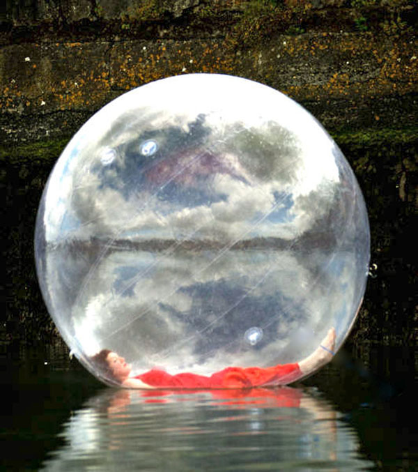 All of Aideen Barry’s work exists in a very fragile balance: a woman performs domestic tasks while levitating; a sculpture promises both the control of cleanliness and the chaos of an explosion; women in flowing red dresses dance on water in giant floating plastic balls, all the while falling comically—and using up the oxygen in the sealed sphere. At each viewing of her work I, too, hold my breath–with anticipation–because anything could happen. Barry was most recently an artist-in-residence at the Headlands Center for the Arts, just north of San Francisco, where we sat down to talk before she flew back to Ireland.