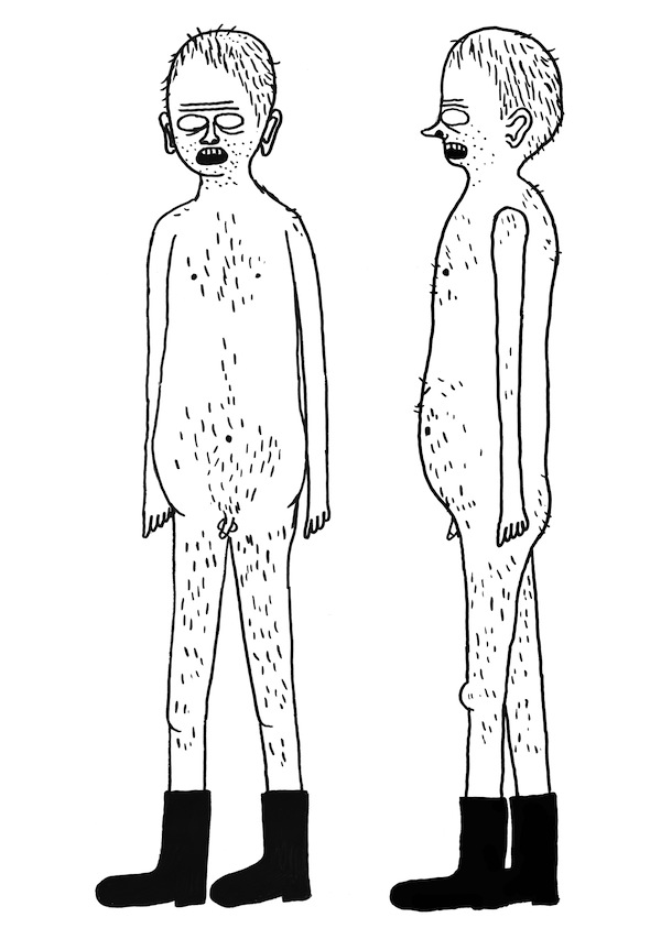 In David Shrigley’s animation Walker, a blank-eyed, hairy patched man wearing nothing but a pair of heavy boots stomps slowly around the circle with great effort, pausing only to grunt and groan. Translating Shrigley’s caustic depictions of flat, trivial characters onto a larger than life screen serves to intensify the acidic humour ever present in his works and give Shrigley’s ‘outsider art’ further dimension.