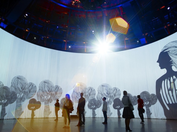 It is a stunning architectural structure – technologically magnificent and psychologically affective due to its vast size – but it is void of any prolonged engagement. However, it is interesting to see how artists have used this unique backdrop and translated their work through it. Shape and scale take front row here – the directionless circular structure of the screen requires a rethinking of the linear quality of video, and the enormous size forces the viewer into a land of giants.
