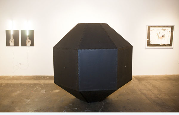 Chris Natrop scrutinizes the concept of infinity on a more microscopic level in that he thinks of his cut out shapes as “molecular bombardments.” Infinity features one of Natrop’s first, stand-alone sculptures, different from the room-sized installation pieces he is used to creating. In all of Natrop’s work, he deals with shapes that he has captured from his memory–spindling, interweaving forms he spontaneously cuts with a knife and hangs with transparent string. Also new to his work is the inclusion of two-way, acrylic mirrors that he had fabricated specifically for the piece displayed at Scion.