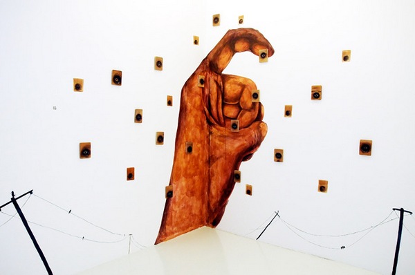 The works in Eye of the Messenger are ironic and multi-layered: dismembered, colourful body parts float in the dimensional space of the canvasses and are tacked onto each other. They can’t be contained by the boundaries of canvas, spilling out of the seams and onto the surrounding white walls. Unlike the luminous simplicity and crack-quality of flat-faced satiric drawings that invite ridicule and laughter, Effendi’s cartoonish works cry out like multiple voices in a Greek tragedy clamouring to claim their own truth. In this context of use, reception and exchange, Effendi’s works accrue a varied interpretive history of – and perhaps even grant absolution to –those who have found finally regained their silenced voices.