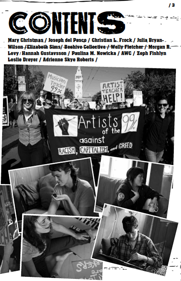 For the last few months, #Hashtags has had one thing on its mind — #occupy. We, too, are part of the 99%. Today, we’re happy to feature Artist Bloc No. 1, a zine devoted to discussing the role of art workers and the Occupy movement. Organized by a group of Bay Area artists, scholars and writers, including Christian L. Frock, Julia Bryan Wilson, and Adrienne Skye Roberts, Artist Bloc No. 1 asks “what are the stakes [of artists and art workers] in the discourse around economics, labor, and access to cultural resources?” We’ve got the first ten pages posted, download the rest at occupationzine, or at Visible Alternative.com.