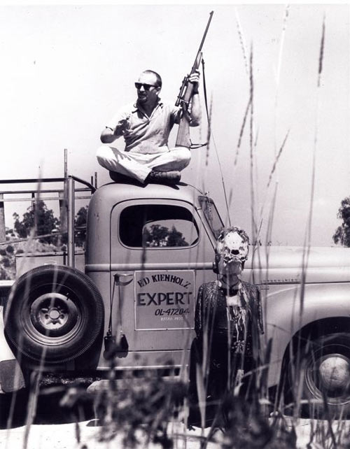 Ed Kienholz sitting on his "Expert" truck, 1960s.