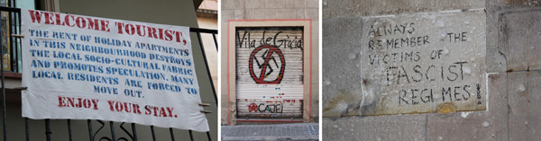 The spirit of revolution persists in home-made posters instructing social action. A stenciled sign tells me that I am welcome here but that the rental of a holiday apartment is destroying the local socio-culutral fabric.