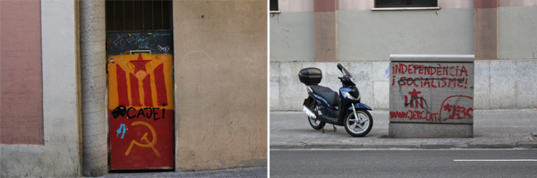 An election last November in the midst of economic troubles brought a change from the socialist policy of Zapatero to the conservative Popular Party headed by Rajoy. Depictions of the hammer and sickle can be found all over the city. Imposed on Spain’s flag, the symbol seem to be leftist or anti-fascist, though not clearly socialist, communist, or anarchist. Some have been defaced with spray paint, showing political factions among those who paint the streets.