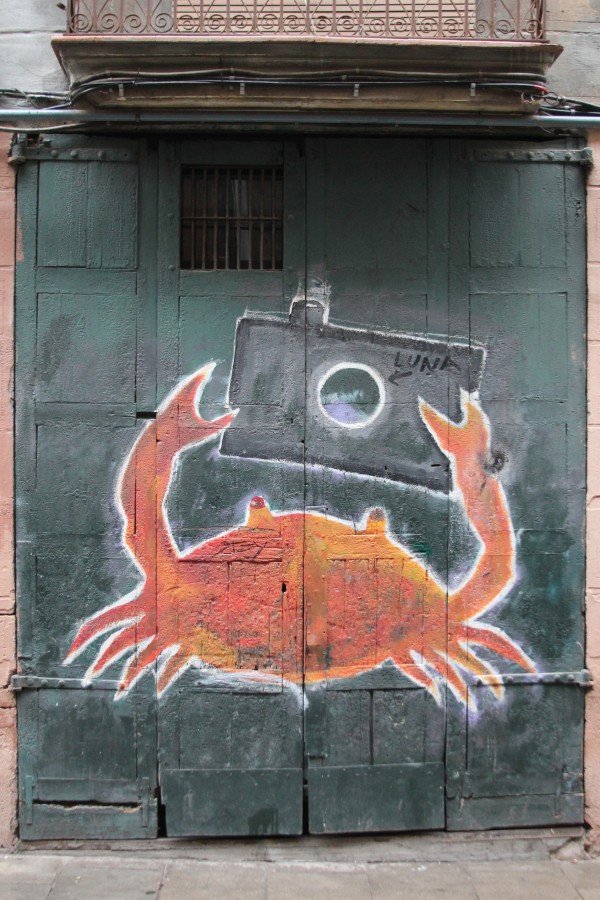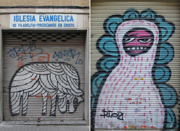 The Guardian reported in their December 2010 article “Barcelona shopkeepers face fines over graffiti decoration” that city officials having been cracking down the street art, from graffiti tags to commissioned works, calling it “antisocial behavior” that “degrades urban fabric.” Sometimes the murals are decorative or creative works but often the paintings seems associated with the stores themselves, working as signs. The quality of the murals varies from door to door and even if not great art, they add to the city’s character.