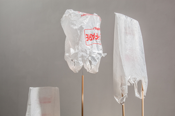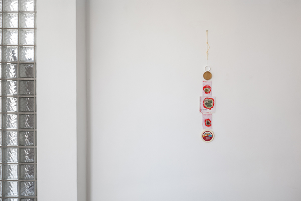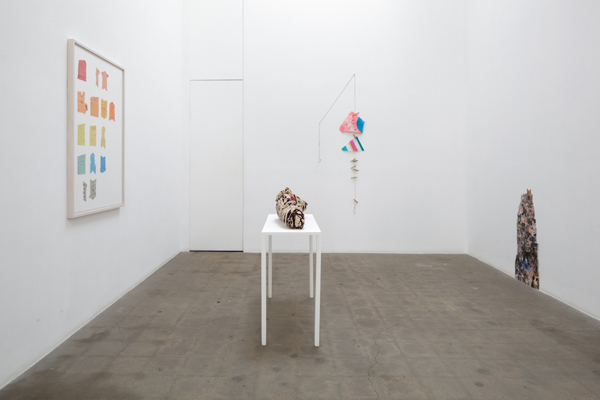 When you walk in, you see plastic bags of staggered heights hung on thin wood poles attached to a wood stand by B. Wurtz. You see a pyramid of cobbled-together cat photographs by Vincent Fecteau on one wall and, on another wall, strips of rubber, locks of hair and paper twisted together by Richard Hawkins cascading down toward a shoe box on the floor. There is a framed collage of coin package wrappers lined up by Gabriel Kuri. Found objects are carefully re-purposed and composed in formally intelligent ways. Nothing even veers toward maximalism; this is minimalist abstraction made out of what you’d find blowing through the streets. It’s easier to appreciate if you’ve seen what minimalist abstraction looks like when it’s highly, expensively fabricated and commanding. This work commands and demands nothing; it’s happy to just exist for those who care to notice.