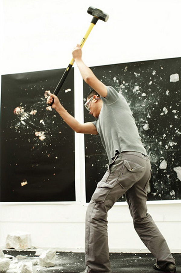 In both iterations, Zhan’s works encapsulate energy in its basest, most raw form at the moment it is discharged, serving as the genesis metaphor for the conceptualisation of art: the primordial, choatic sea of colliding ideas on which artistic process and practice are established. Universe is not a crystalline model of time or one that demands a fixed vision of scientific history; it is rather, focused on an infinitesimal moment that has no witnesses but about which countless speculations have abounded. Zhan’s works are also built on a premise that is inherently contradictory: he destroys only to (re)create; the resulting assembly of rock fragments are near-negligible visual cues demonstrating an outcome of a significant event – the cosmos that we understand today – to the audience. However, it is the scientifically unrecorded events – the existing theoretical conjecture surrounding the details of the universe’s formation – that force us to delve deep into the universe of our own imagination.