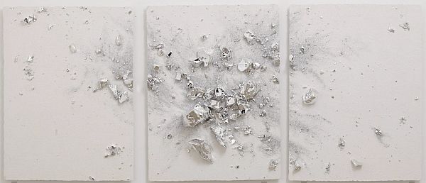 Zhan’s Universe (2012) at the Singapore Tyler Print Institute is materially and thematically fashioned after My Personal Universe, employing – in a vastly scaled-down version – similar artistic processes and reiterations of the physical dimensions of shattered rocks. Lacking the flashy pizzazz of its predecessor and constrained by certain spatial parameters, the mode of production and the materials differ in this show; rocks were shattered with a sledgehammer instead of a dynamite, and later re-assembled as aluminium-coated replicas on paper slabs and on highly polished mirrors. The original rock fragments were pounded by hand into fine sediment and mixed with cotton pulp to produce a solid paper base; the resulting effect is one which reveals the natural mineral pigments of clay, slate and granite.