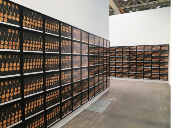 Art Unlimited takes place in Hall 1, where each booth is dedicated to a singular artist. Philip-Lorca diCorcia showed a seemingly endless collection of tiny Polaroid photographs, each one as impressively interesting and magical as the last. Also making an impact in perpetuity, were rows and rows of photographs of partially eaten round bread by Jitish Kallat. The cratered roti crescents represented changing lunar cycles, memorializing the artist’s father by touchingly recreating every moon of every night he lived. Ragnar Kjartansson showed a number of hilarious canvases, a series of painted self-portraits in his skivvies usually involving piles of beer bottles or the effects thereof. Each of the 144 works was painted in sequence for every day of the Venice Biennale. Also, a video by Tony Morgan called Resurrection showed the ‘life-cycle’ of a steak in reverse. Starting with each bite exiting the mouth of a man, the steak continues to be uncooked on a stove, uncarved from a hanging butcher’s carcass and finally the film climaxes with the un-demise of the poor cow who magically comes back to life. Nina Beier’s work, Tragedy, was the first work I have seen of its kind: a dog performance piece. Yes, dog. Delightfully absurd, a trained dog would be formally escorted to the booth and instructed to ‘play dead’ on a spotlighted oriental rug for several minutes, melodramatically performing its own demise. Other favorites included an awe-inspiring monumental canvas by Rudolf Stingel, and copper works by Walead Beshty performatively hand-marked over time by art handlers, the hidden heroes of the art world.