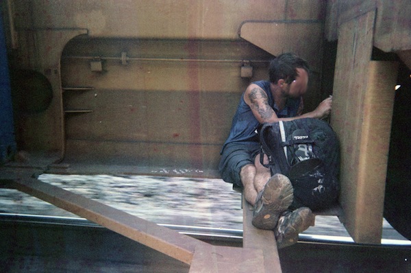 CD: The clandestine rider is using a system that once was a great symbol of progress (like the interstate highway system); now he’s an outsider in the industrial landscape, mostly vacant.