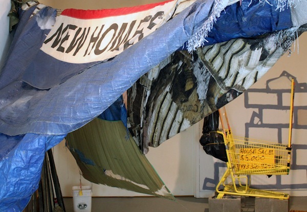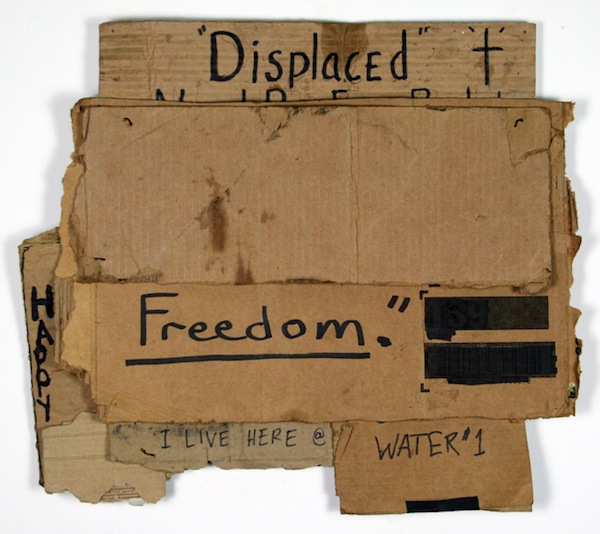 The found object college pieces titled Another Way, began as hitchhiking signs collected from my travels hopping freight trains in California, Oregon and Washington. Once back in Baltimore, I began noticing the signage on local bodegas as well as the cardboard signs of the local homeless. The final artwork didn’t take shape until the Occupation of Zuccotti Park. Once in the park, I collected protest signs from my fellow Occupiers. At that point I began mixing those worlds, small business, travelers, activists, and the homeless. The resulting works took the shape of the common struggles experienced between those groups.