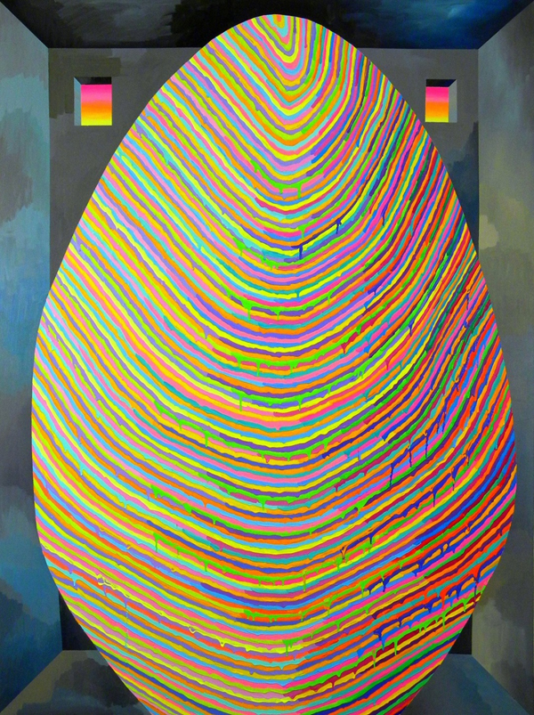 Zefeldt’s painting may not be offensive to Tufte. There is a smoothness to Zefeldt’s rainbow palette and a simplicity of form that brings clarity. Tufte notes the capacity for “small spots of intense, saturated color for carrying information” in contrast to a dull background. Though Zefeldt does not bring us such banality, his backgrounds allow for a complex and textural form to be present as the foreground figure. Tufte wants us to “escape flatland” in design, for data to be a rich and complex experience without feeling burdened by detail or attentive to unnecessary elements of design that bother us rather than enrich content.