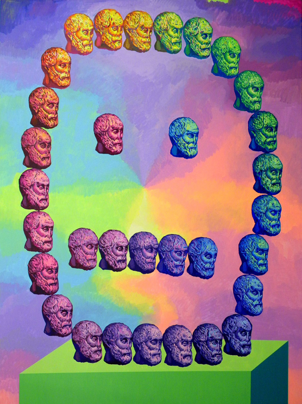 There is some repulsion to all these rainbowed compositions. Form is rendered somewhat formless, to disturb the viewer’s preference for perfect gradation in comprehending space. But the effect of light on planes is illustrated eccentrically and this new kind of light is fun to understand. Tufte says “Pure, bright or very strong colors have loud, unbearable effects when they stand unrelieved overlarge areas adjacent to each other…” and that “…signal enhancement through noise reduction can reduce viewer fatigue…” in Envisioning Information. Zefeldt’s tactics seem to run contrary to Tufte’s theories of good design, at least in limiting the palette, but I wonder how Tufte would respond to this work (though design is not visual art, there is essential overlap as they operate on the same sense). Painting that is undulating and disturbing to elegance is part of the content conveyed. There is some bombardment of color in “Head Face” and other paintings that is relieved by the clean edges of form.