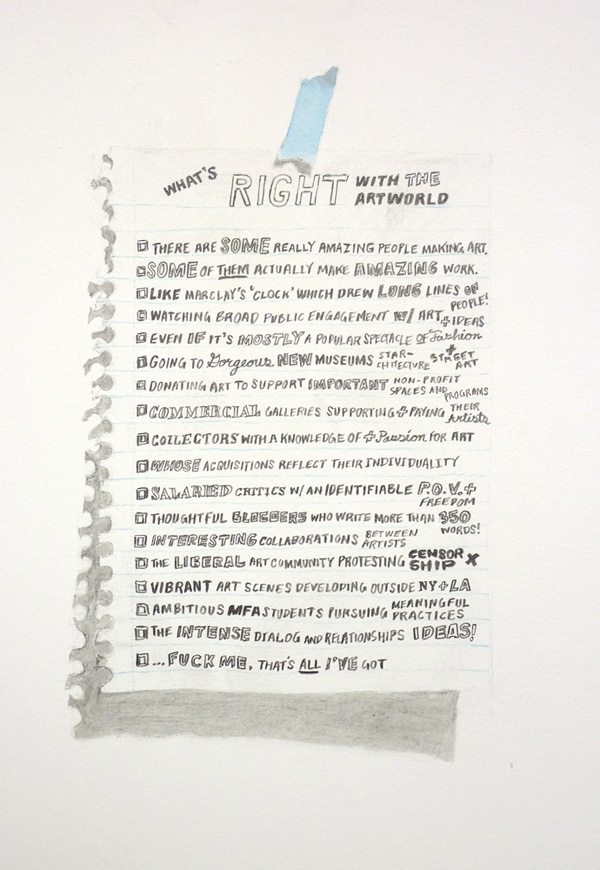 WP: It’s been changing over the years. The drawings have started to split, like What’s Right with the Art World and What’s Wrong with the Art World. Despite all the ranting and raving, there’s always been this vulnerable part of the voice. I meet people who are terribly optimistic about how the art world works—they’re realistic as well, they don’t deny that a lot of it is crazy—but they still see it as an amazing place to work.