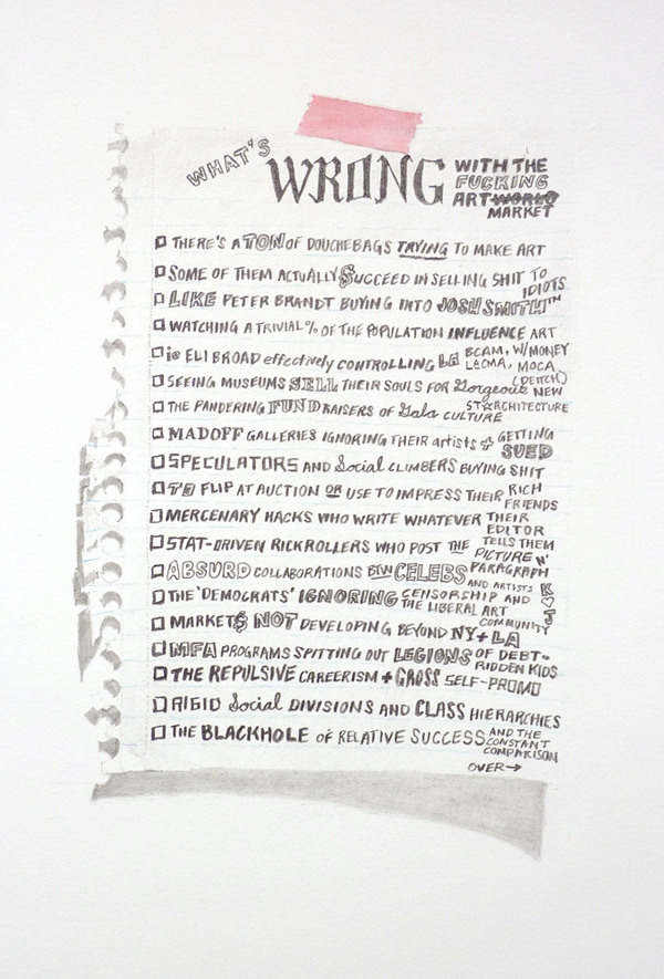 William Powhida’s text-based drawings* skewer the contemporary art world with relish. From fake Rolling Stone magazine pages to charts explaining economic relationships, or trompe l’oeil pages torn from the notebook of an art-world malcontent, Powhida sticks his finger into the wounds of modern culture. For example, What Do Prices Reflect? pessimistically lists the rationale used to determine an artwork’s financial value: “Whether or not the work will impress your cultured friends…A highly ritualized exercise in shared delusions…The informal collusion of taste in a statistically insignificant % of the population.” By turns sad, true, and laugh-out-loud funny, his schadenfreude-inducing drawings call out the major players, poke fun at the artist as a brand, and divulge the art world’s dirty little secrets. Powhida and I talked this summer at the Headlands Center for the Arts, where he was a resident artist.