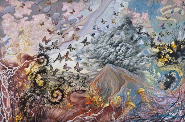 According to chaos theory, a single flap from the wings of a butterfly can set off a string of events leading to major global changes. It’s no coincidence that the butterfly is the chosen catalyst in this theoretical scenario; symbolically, butterflies have been a remarkably durable representation of change, transition, transformation, and resurrection in the human imagination. In Erika Harrsch’s exhibition “Under One Sky” at Kasia Kay Art Projects Gallery, butterflies – and their potential to transform the world – are a primary visual motif.