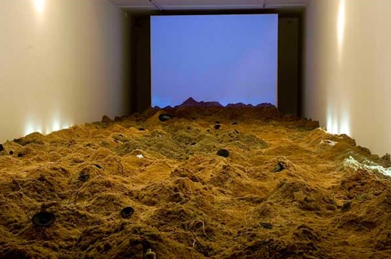 Galeria Laura Marsiaj (Rio de Janeiro) transformed their booth into a sand-filled dune for the installation, sound, and video-based work of Paulo Vivacqua, “Desert” (2012). Projected upon the back wall are the summits of a tawny mountain ridge against a slate sky – unspecific to any one region. Buried in the sand are several glass columns – in which audio channels and speakers are housed – that emit ambient, meditative sounds. Wind rushing, cicadas hissing, and voices whispering meld into a hypnotic sibilance, and are carefully interwoven with the artist’s own atmospheric compositions. Meant to represent the lapse of a full day within eight minutes, the installation is haunting and tranquil – a nod to the lost repose in our increasingly harried lives.