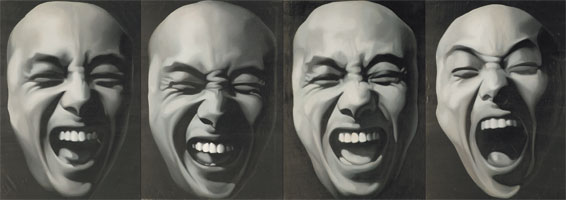 Geng’s early anti-authoritarian projects tended towards stressing the social responsibility of the artist; in this case, they were critiques of the prevailing dynastic legacy of Mao – a brand of socialist realism and repression that still shackled Chinese society well into the years with his successor Deng Xiaoping at the political helm. A seminal work, The Second Situation (1987) is a quadriptic that portrays black and white faces distorted with soundless, cynical laughter. It is a suggestion that laughter, a basic human response to joy has been rendered ambivalent in a society culturally conditioned to prioritise the elements of Confucian teachings emphasising stoic restraint and kinships with the community above individual passions. More importantly, The Second Situation helped pioneer the Cynical Realism movement: a widely shared sentiment of disenchantment among artists such as Fang Lijun and Liu Wei who had, during this period, produced a series of works ridiculing the socio-political malaise that afflicted China.