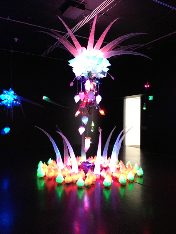 The flickering, multicolored lights of Shih Chieh Huang’s installation Synthetic Seduction, now on view at the Yerba Buena Center for the Arts, reminds me of the cellular and molecular models found in biology classrooms. When I was a student, one of the ways in which I learned about organic forms was by placing mitochondria, lysosomes, and nuclei in their correct locations in these models. Huang also re-creates life with synthetic, mundane materials, but she does so with much more technical and mechanical sophistication. While Huang’s forms may not overtly mimic reality, his work serves as an interpretation of structures operating in concert.