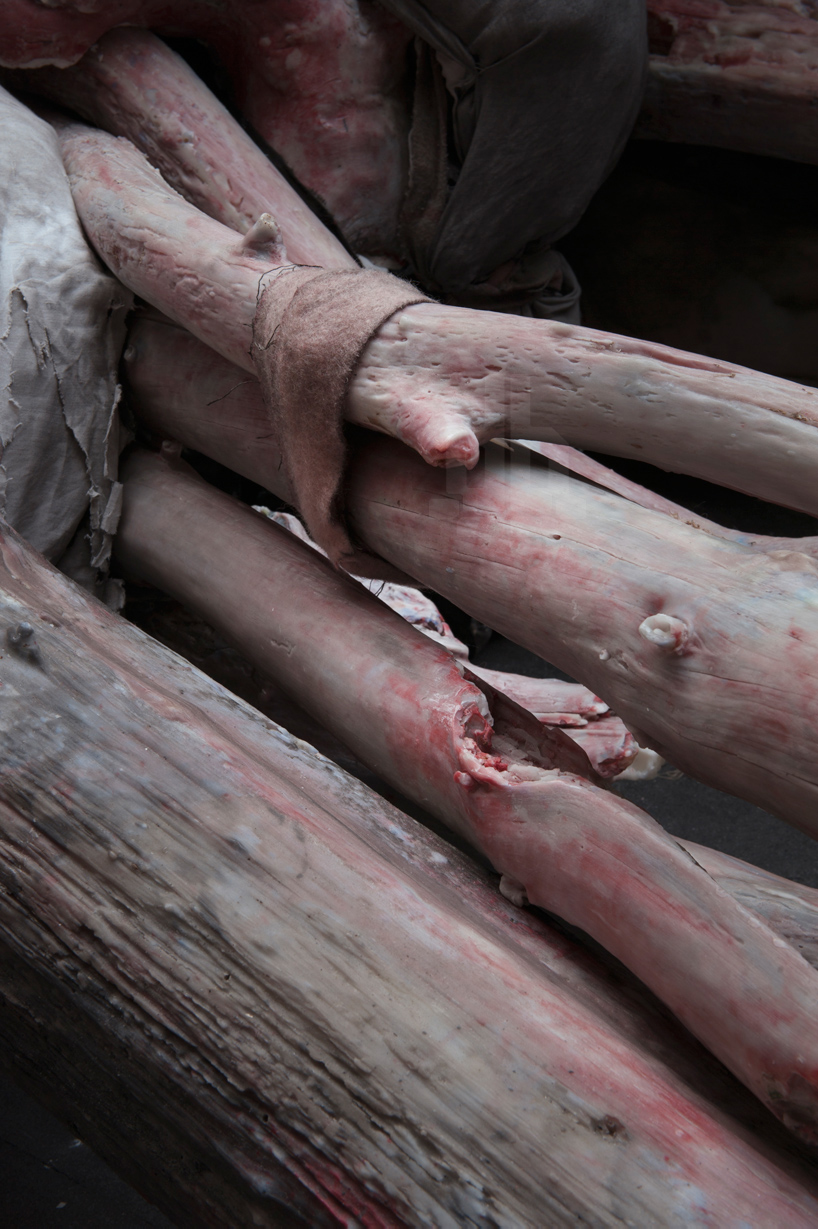 Berlinde De Bruyckere. Kreupelhout–Cripplewood, 2012–13 (detail); wax, epoxy, iron, textile, rope, paint, gypsum, roofing; 368 7/8 x 394 1/2 x 663 3/4 in. Courtesy of the Artist and S.M.A.C.K., the Museum of Contemporary Art, Ghent. Photo: Mirjam Pevriendt