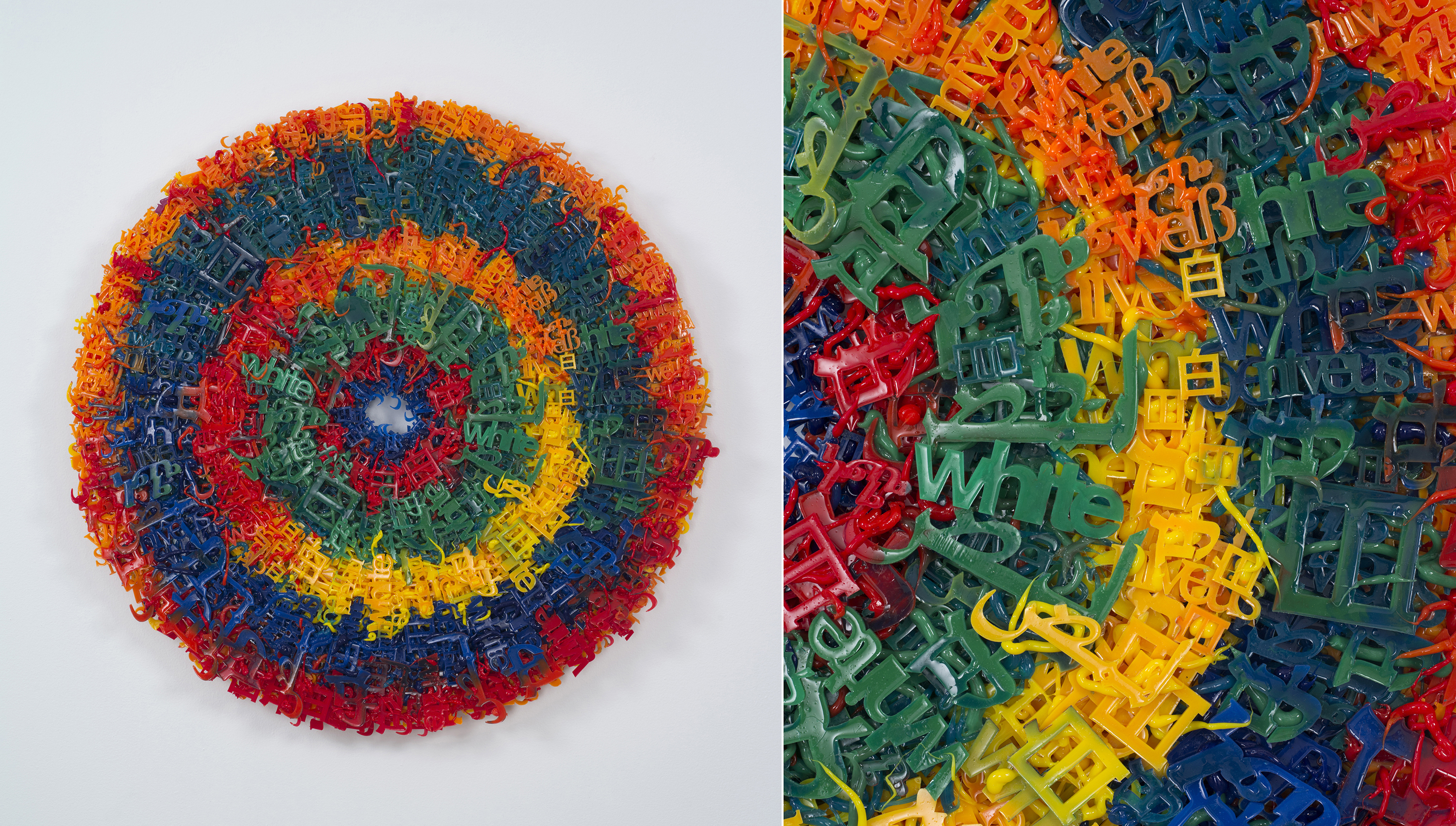 Wood, silicone words in nine languages: Amharic, Arabic, English, German, Hebrew, Japanese, Chinese, Latin, Russian. Diameter 42 in., depth 2 in. Courtesy bitforms gallery nyc, Photo: John Berens