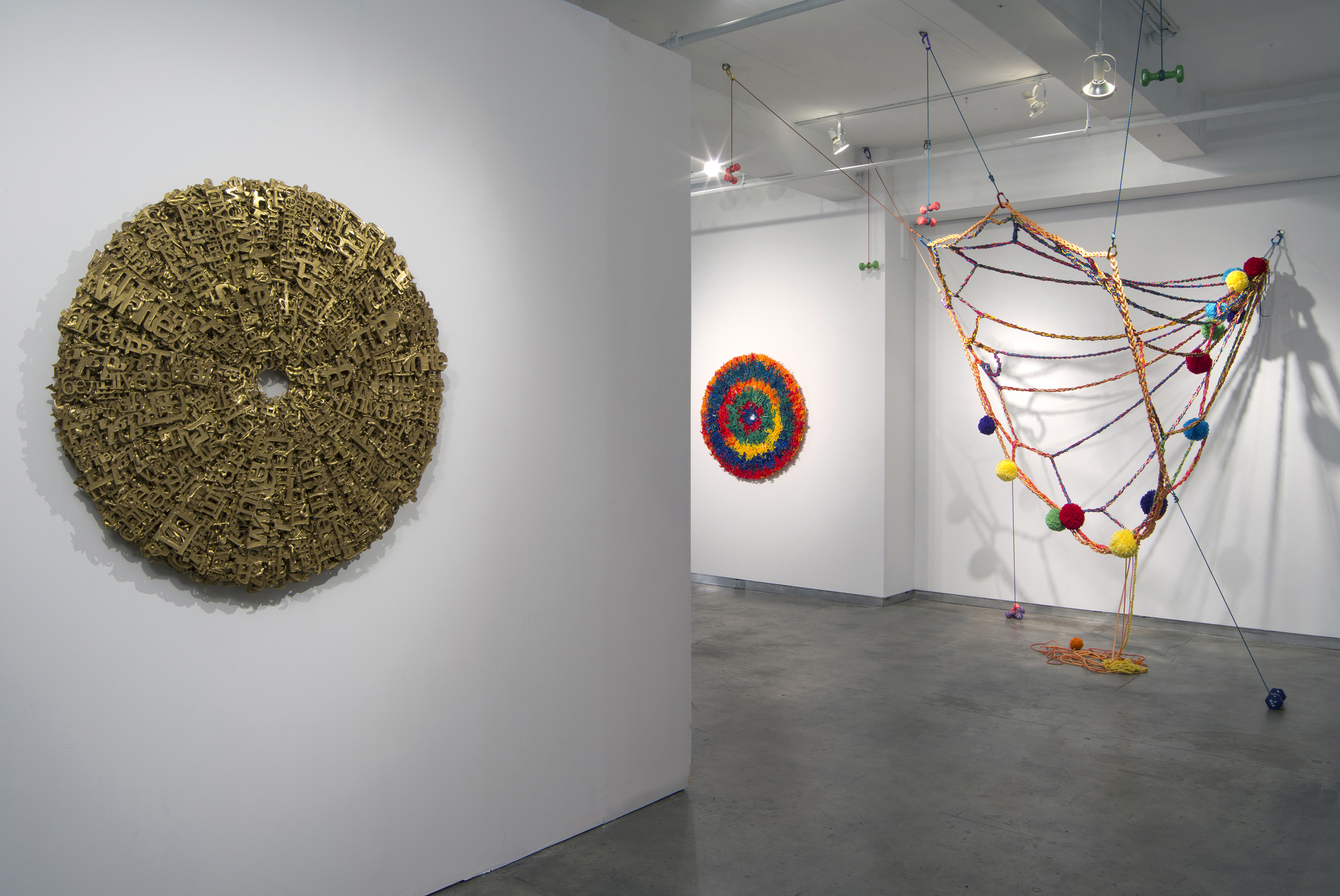 Yael Kanarek. Installation view (left to right): Sanctify Thyself No. 1; Deeply Concentric; Perpetual Dream Catcher; all 2013. Courtesy of bitforms gallery nyc, Photo: John Berens