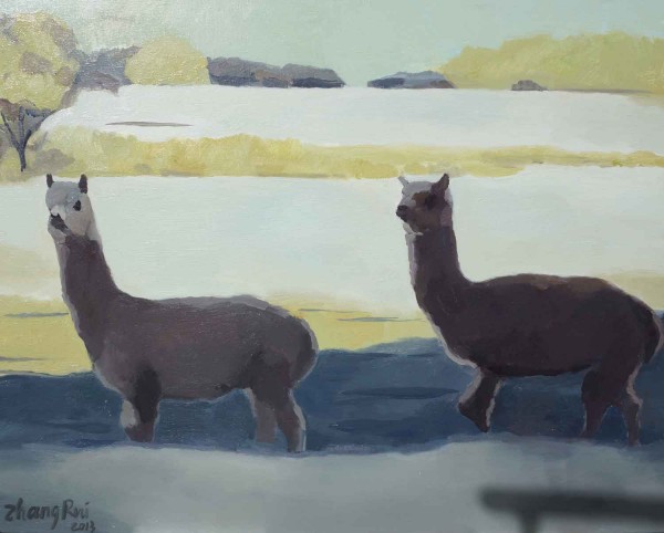 A painting of alpacas against a rural background hides a subversive meaning, too. In China, the name for these animals, grass mud horse, or caonima, has been given an entirely new meaning by netizens circumventing government censorship of “vulgar content”: in Mandarin it sounds like an obscene curse. Around 2009 the term became an internet meme and Ai Weiwei has made use of it several times, including in his “Gangnam Style” parody, “Grass Mud Horse Style.” With deadpan understatement, Zhang Rui says she was “very excited to see many grass mud horses in Australia.”