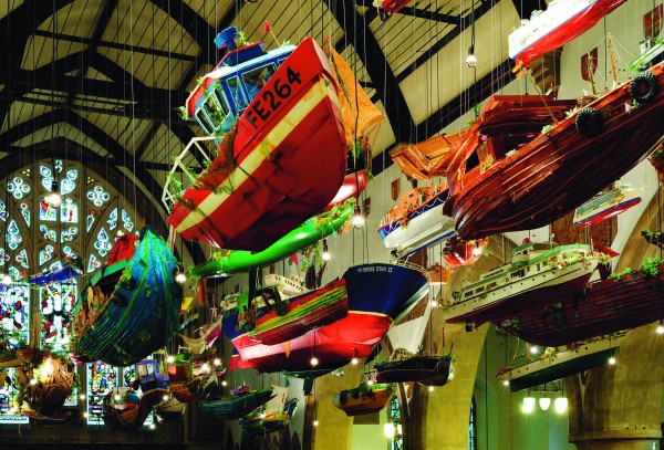 While the gaze controls the borders at sea, the boat represents the possibility of transgression. Hew Locke’s work For Those in Peril on the Sea (2001) consists of nearly one hundred model ships installed in the oldest church in Folkstone, which were collected from around the world, as well as fabricated in Locke’s studio from his trademark cheap, colorful plastic materials. The boat here stands as a symbol of migration, transnational locality, and heterotopias; it represents the possibility for escape and the dissolution of borders in international waters. However, with over-saturated media images and stories of tsunamis, pirates, and oil spills ever-present, attention has also be drawn to the vulnerabilities and dangers of this non-place. The ship may represent autonomy, but it is also the space susceptible to the perils of the sea.