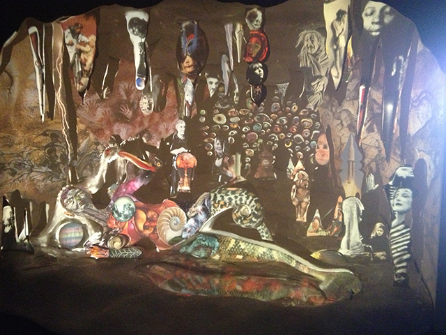 Shary Boyle. The Cave Painter, 2013. Plaster, wood, foam, synthetic hair, sculpting epoxy, metal, paint, glitter, glass, three overhead projectors on custom-sculpted plinth, photo-collage projection acetates, timer sequencer. Canada Pavilion. Photo by the author.
