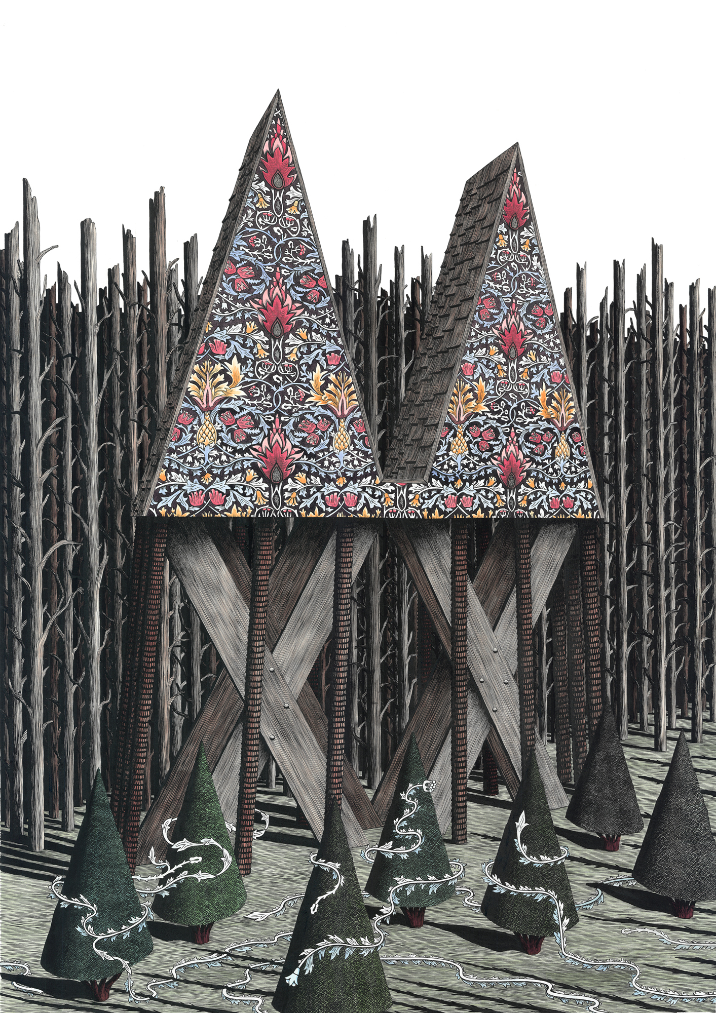 Luke Painter, The Two Towers of William Morris 2, Colored and India ink on paper, 2012. 36 × 48 in. Image courtesy the artist and Le Gallery
