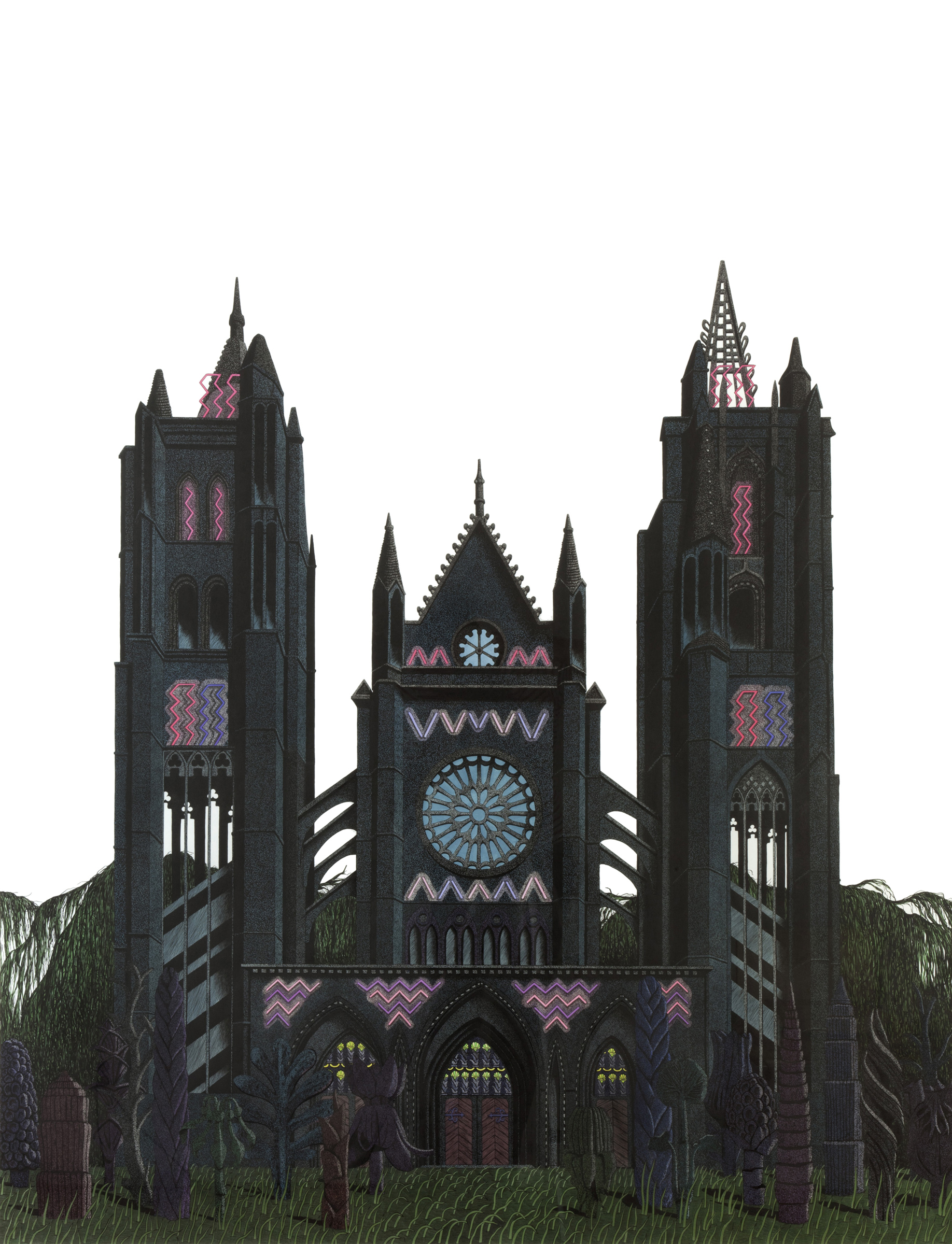 Luke Painter, Cathedral (Neon Gothic), ink on paper, 2013. 60 x 45 in. Image courtesy the artist and Le Gallery. Documentation by Darren Rigo