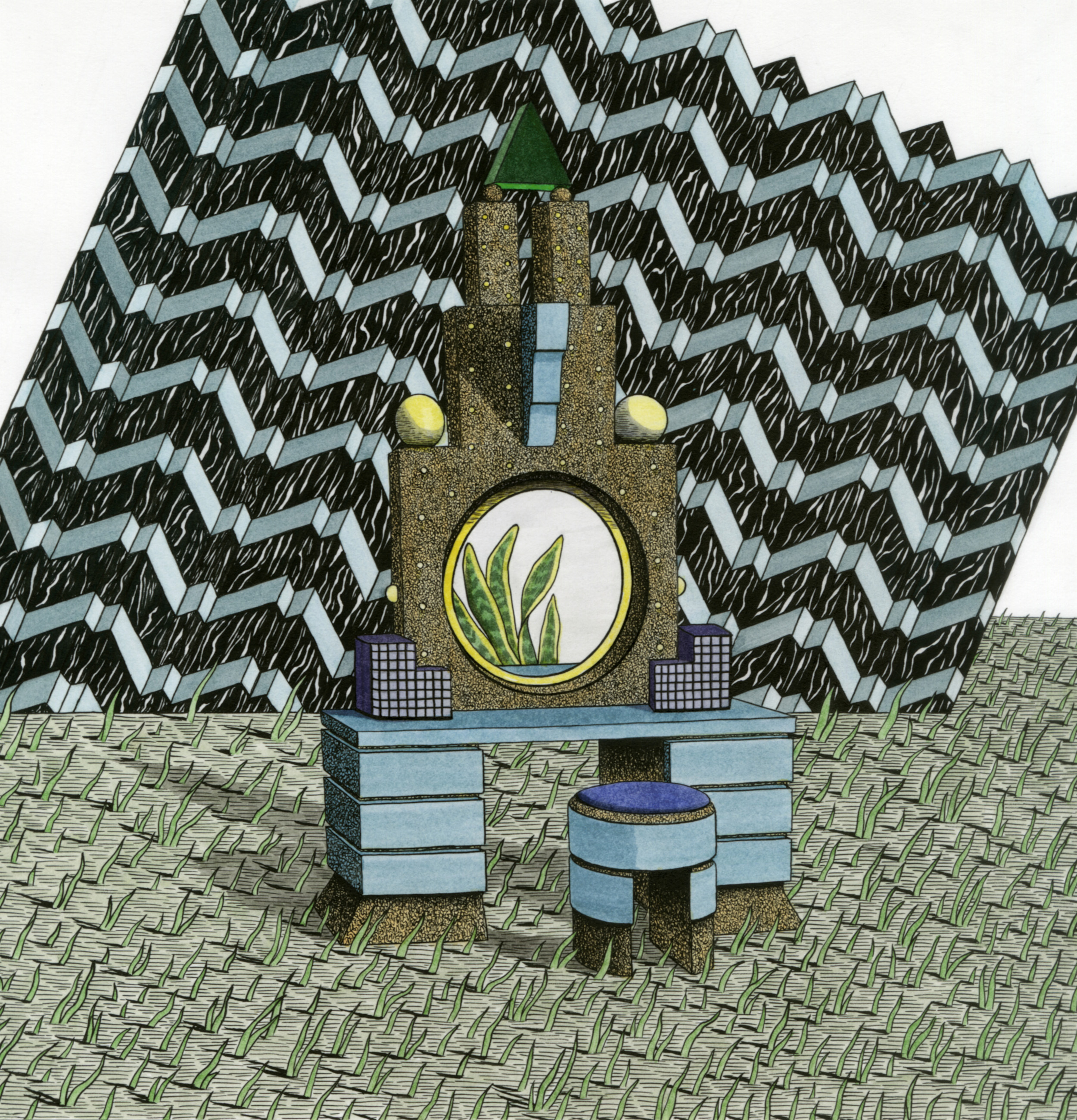 Luke Painter, Self Aware Plant and 1980’s Vanity (Michael Graves), ink on paper, 2013. 12 x 12 in. Image courtesy the artist and Le Gallery