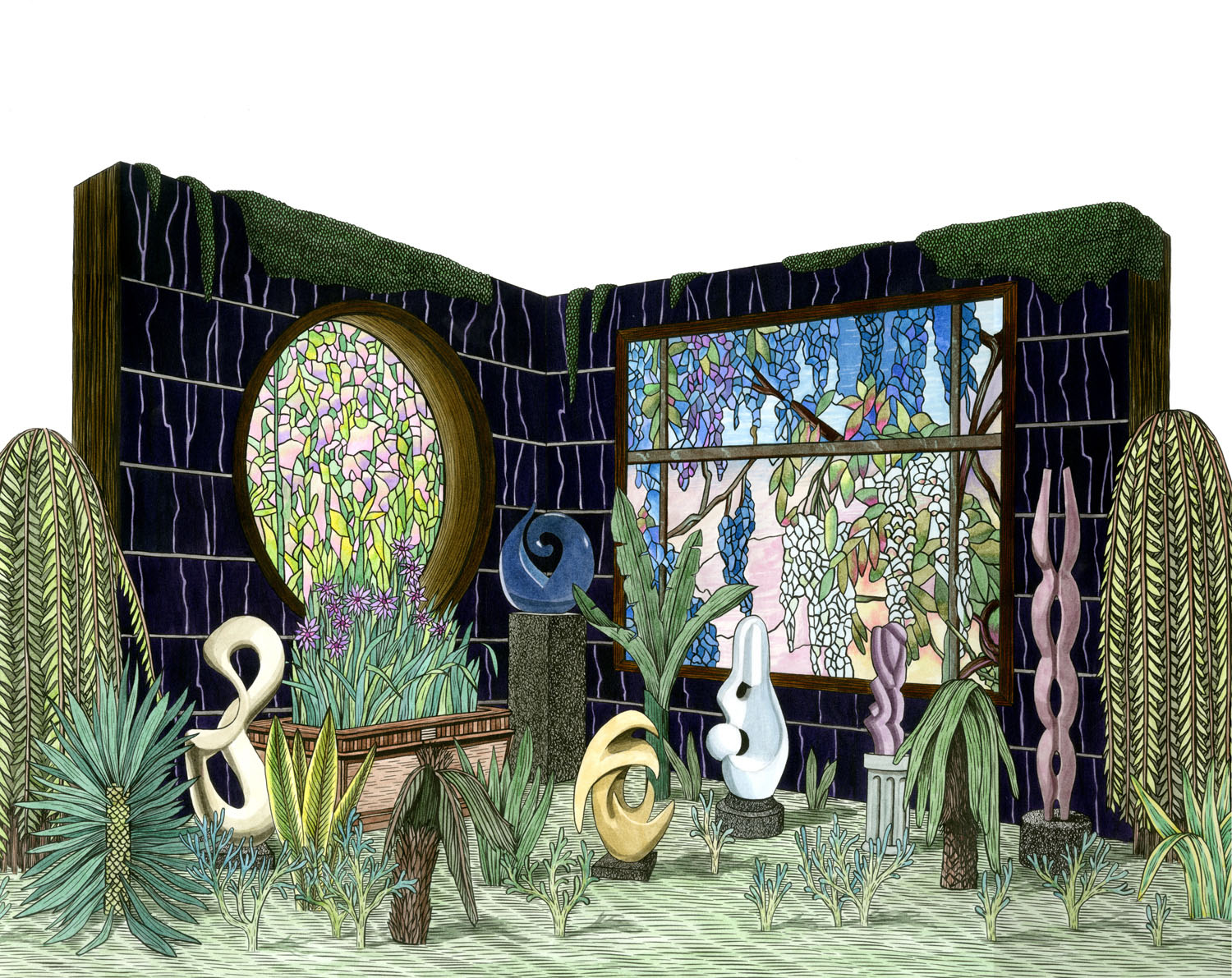 This body of work seems to mark a transitional period for Painter. Previously, a number of his works included surreal, anthropomorphic topiaries. Intricately articulated fauna and lush domesticated landscapes still dominate in the current body of work, but their anthropomorphic qualities are more refined; they breathe and move in the compositions, but this movement is more tied into the repetition and movement intrinsic to pattern making. Similarly, there is a break in Painter’s use of architecture in this series; in the past, architectural buildings were rendered whole; now he is beginning to deconstruct these structures. Greenery organically seeps in and takes over the interiors of these spaces, suggesting an underlying sentience. Drawings such as Self Aware Plant and 1980’s Vanity (Michael Graves) (2013) allude to the ruinophilia that romanticizes the utopic vision of futuristic 1980s decorative movements.