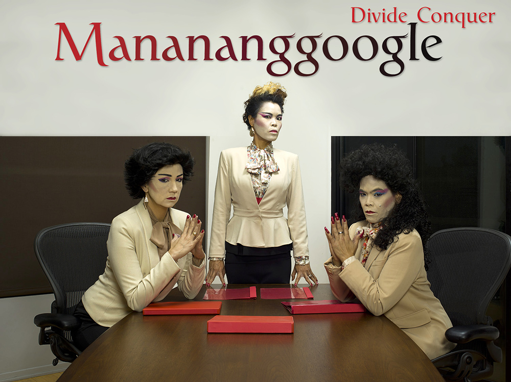 As the booming tech industry displaces scores of longtime residents, it is tempting to direct ire at the corporations who attract and generate all of this new money. Filipina performance art collective Mail Order Brides/M.O.B. have satirized the winner-take-all mentality of Silicon Valley with Manananggoogle, a work commissioned by the San Jose Museum of Art in which the three portray high-powered female executives in the mode of Sheryl Sandberg and Marissa Mayer. “J. Baby Wofford,” “E. Neneng Barrios,” and “R. Immaculata Estrada” performed Divide//Conquer: The Manananggoogle Onboarding Experience as part of The Long Conversation, an exhibition commemorating long-standing alternative art space Southern Exposure’s impending 39th anniversary. This occasion is made more monumental by the truth of how few spaces founded in that germinating moment of the 1970s are still around and fiscally sustainable. Incorporating found video, text, live performance, and social intervention, M.O.B. applies a mode of cannibalistic appropriation derived from Latin American Modernist precedents to a contemporary milieu in which the primitive and the futuristic are both intertwined and interchangeable.