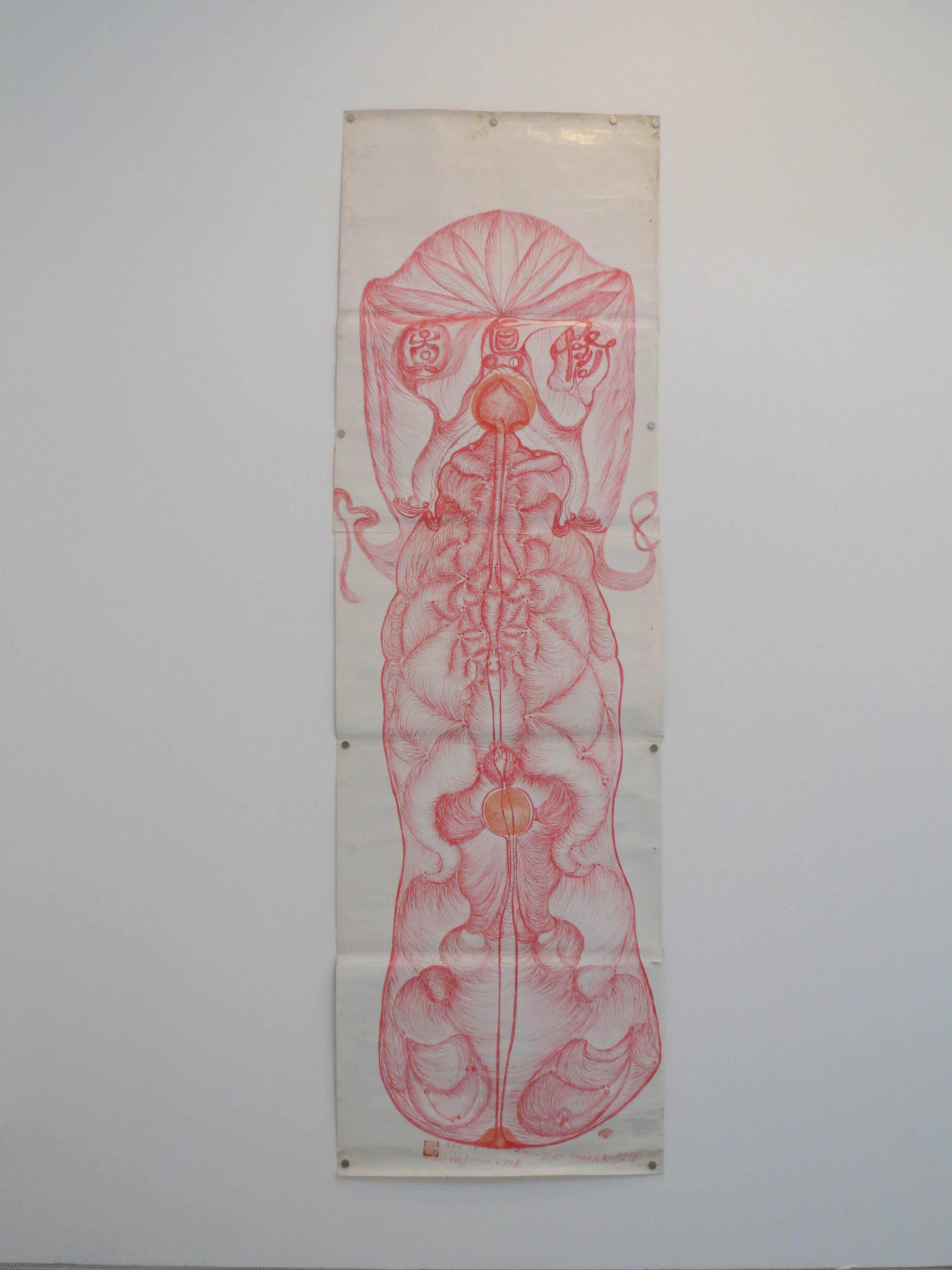 The exhibition is divided between self-taught and professionally trained artists. For an example of the phenomena that I describe above, it is instructive to compare the treatment of two Chinese artists, one of whom has come up through the contemporary art system, the other of whom is regarded as a naïve artist. Kan Xuan is represented with a bank of video monitors that display footage of Imperial tombs within China, many of which now function as tourist sites. Her work, which takes an archaeological and technological view of her culture, is “contemporary” because she quantifies local traditions within a structure of classification and analysis derived from European models. In contrast, the late Guo Fengyi, a self-taught artist, is considered a visionary who conducted, rather than created, imagery. Guo engaged with “cosmologies” of the body in drawings related to the traditions of Qi Gong. This is an ancient healing practice, equally tied to Chinese medical precedents as it is to spiritual ones. Guo was practicing Qi Gong at a time when Chinese authorities were severely prosecuting leaders of groups engaged in the practice as charlatans spreading irrational pseudo-science (but also as potential political rivals to the party oligarchy). She was attempting to heal her own labor-induced injuries and those of others. As such, her assertion of faith as her artistic motivation was an act of political subversion. Nonetheless, possible understandings of her practice of Qi Gong or of art are limited to talk of ancient Chinese spirit wisdom, never rational choice. Kan, whose work is encyclopedic and data-driven, is allowed the capacity for thought, while Guo is described as acting on instinct. The distinction between Kan as an “insider” and Guo as an “outsider” also speaks to the ways in which non-Western artists are pressured to articulate their concerns in European-American terms or be characterized as lacking in intellectual capacity.