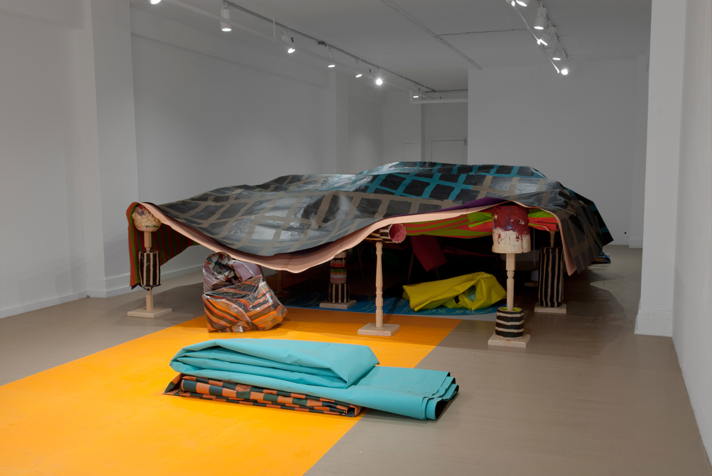 Séripop (Yannick Desranleau and Chloe Lum), This Particular Bias Will Nonetheless Set Up a Vast Field For The Unforeseen, Screen printed paper, wood, chairs, stool, spools, polyurethane foam, tempera, c-clamps, PVC shrink wrap, fabric, rope, rubber, 2013. Installation view at Galerie Hugues Charbonneau, Montréal, Canada. Photo: Éliane Excoffier. Image courtesy of the artists.