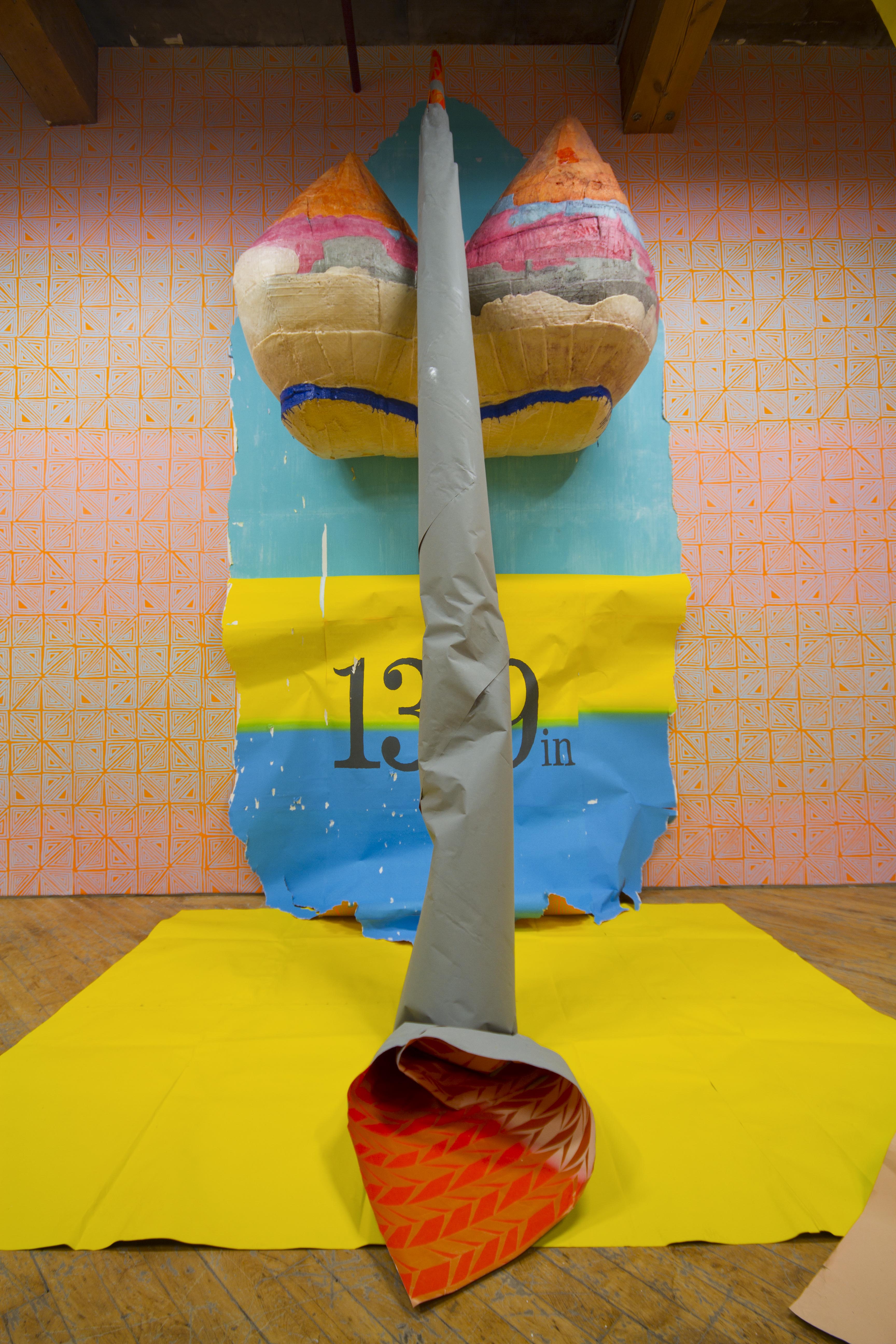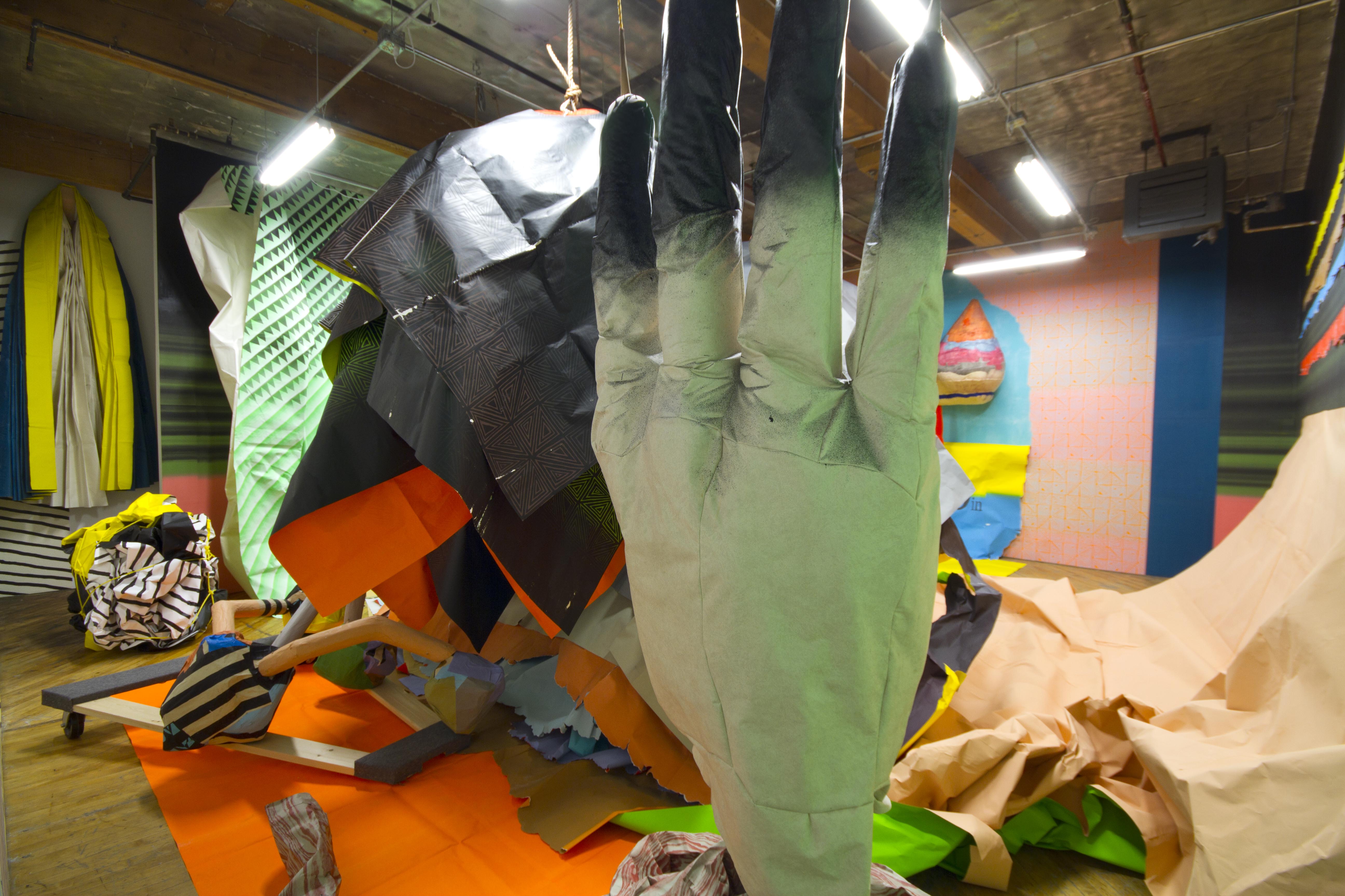 Séripop (Yannick Desranleau and Chloe Lum), Looming, screen printed paper, polyurethane foam, wood, paper mâché, felt-backed vinyl, fabric, paint, pantyhoses, fiber glass insulation batts, cardboard, plaster, hooks, pulleys, rope, found objects, 2013. Photo: Allan Kosmajac.
