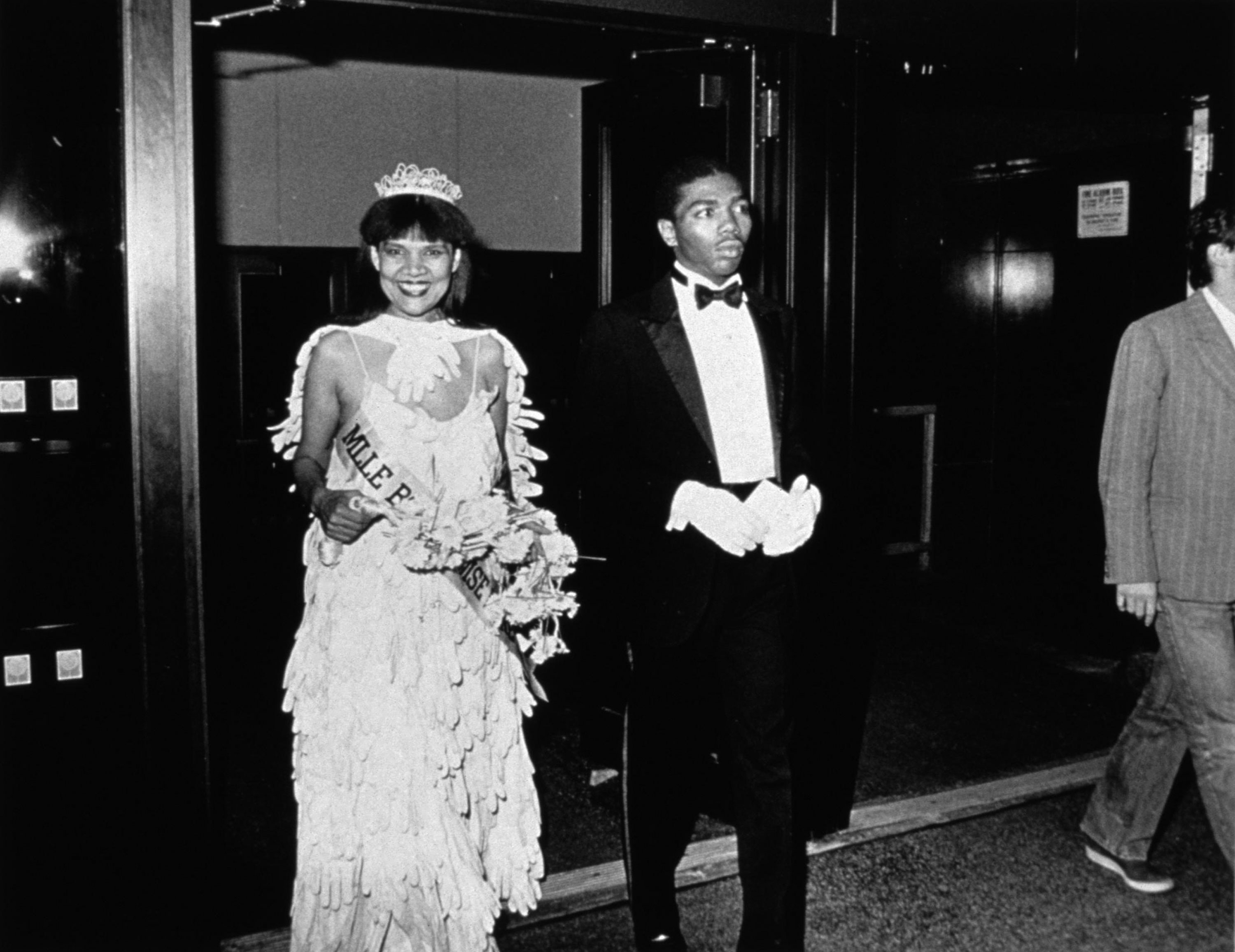 Lorraine O’Grady. Untitled (Mlle. Bourgeoise Noire and her Master of Ceremonies enter the New Museum), 1980–83, printed 2009. Gelatin silver print. 7 1/4 x 9 1/4 in. Courtesy the artist and Alexander Gray Associates, New York. Included in Radical Presence at Grey Art Gallery.