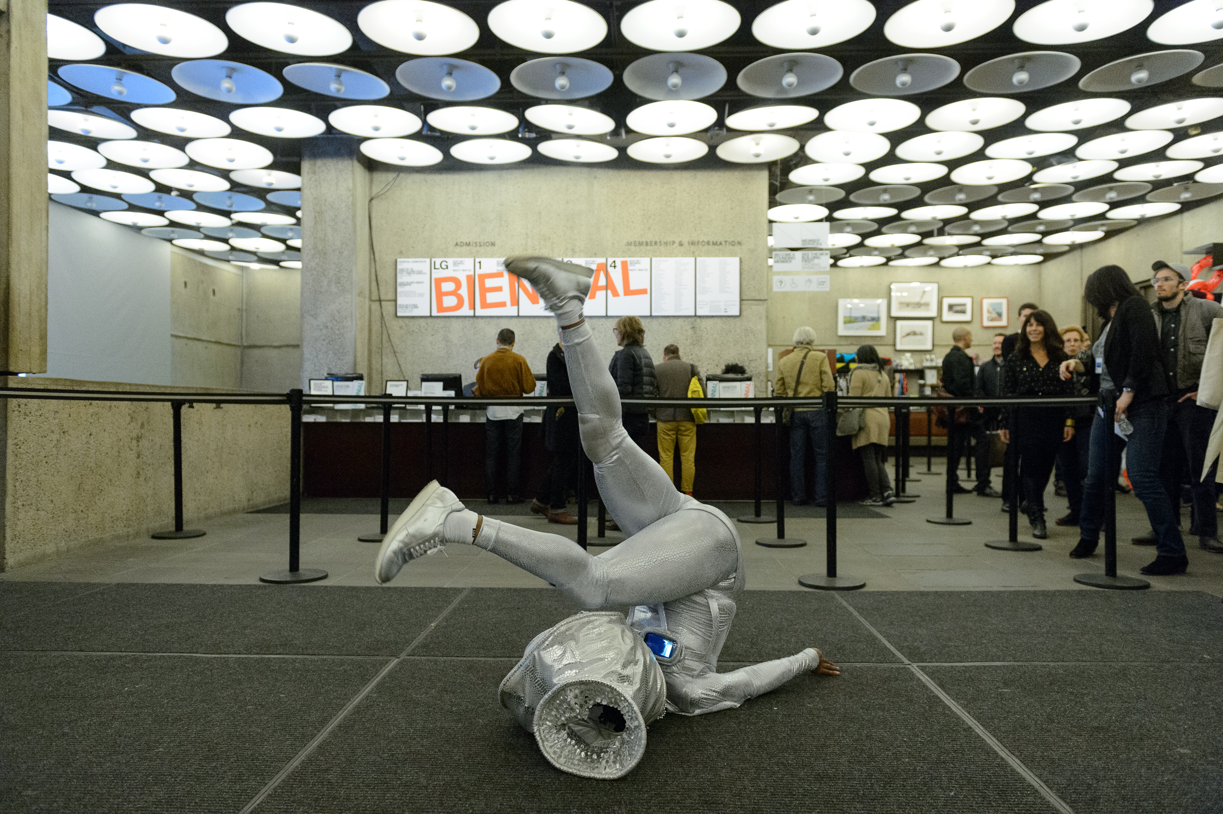 As we filed into the lower level of the Whitney’s vestibule, video artist Jacolby Satterwhite vogued nimbly around the lobby carpet in a silver suit and helmet, out of which screens protruded like sexualized mushrooms (an iPhone trunk sprouted from his crotch). Under the harsh fluorescents, Satterwhite was one of the most proactive warriors in Muñoz’s army that night. A literal embodiment of theory, Satterwhite’s movements assertively performed queer futurity into existence on the indifferent lobby floor.