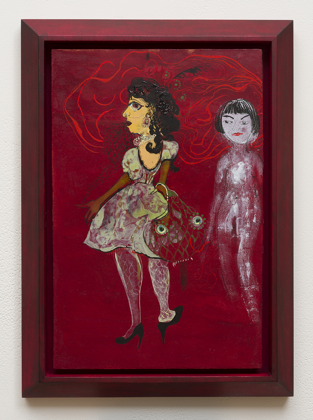 Rina Banerjee. Dressmaker and Shopping girl: Chinese goods and garment Industry tinsel, made in Hong Kong, made in India for export from port to port made by small hands and little hands, short people from far away lands. Dressmaker ghost follows me around from shop to shop in Big country with large people with Big hands and high heels, 2014; acrylic and ink on birch panel; framed: 14 1/4 x 10 1/4 x 1 1/2 in. (36.2 x 26 x 3.8 cm). Copyright Rina Banerjee. Image courtesy of L.A. Louver, Venice, CA.