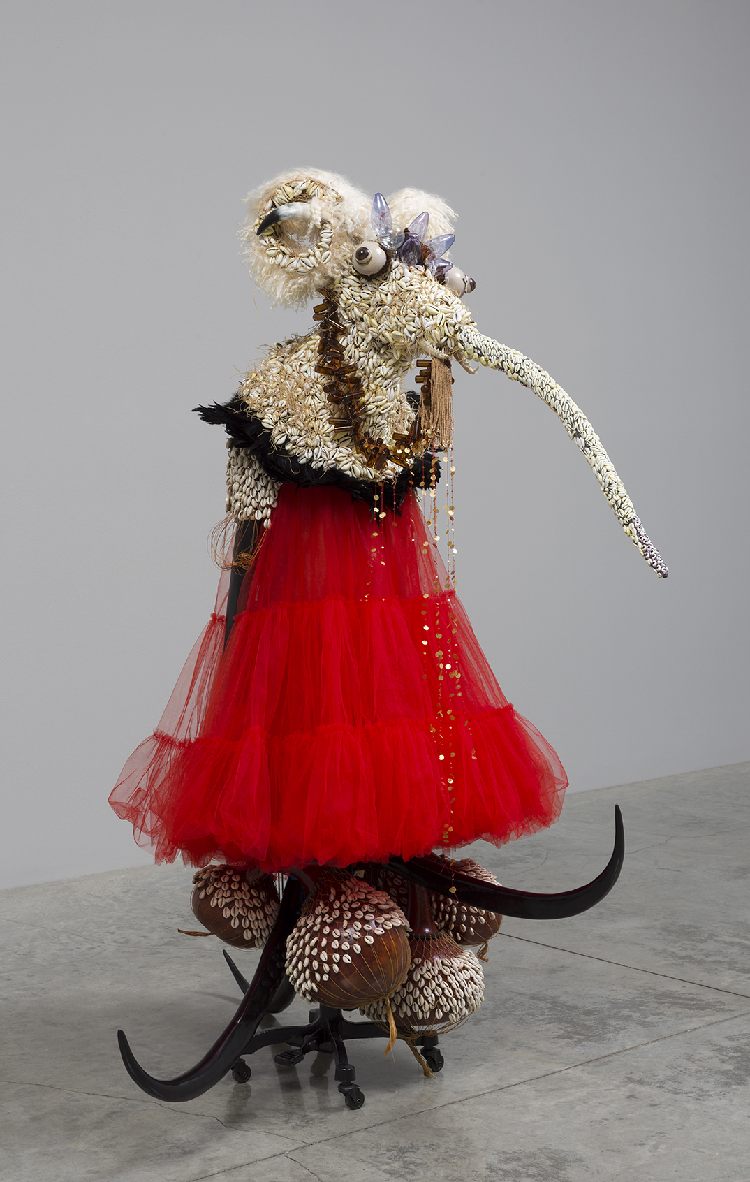 Rina Banerjee. She was now in western style dress covered in part of Empires’ ruffle and red dress, had a foreign and peculiar race, a Ganesha who had lost her head, was thrown across sea until herself shipwrecked. A native of Bangladesh lost foot to root in Videsh, followed her mother full stop on forehead, trapped tongue of horn and grew ram-like under stress, 2011; cowrie shells, rooster feather, gourds, acrylic horns, ceramic balls, plastic netting, amber glass vials, violet glass bulbs, false glass doe eyeballs, silk and synthetic Lanvin ruffled red dress; 73 x 65 in. dia. (185.4 x 165.1 cm). Copyright Rina Banerjee. Image courtesy of L.A. Louver, Venice, CA.